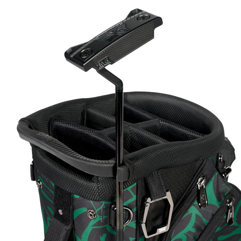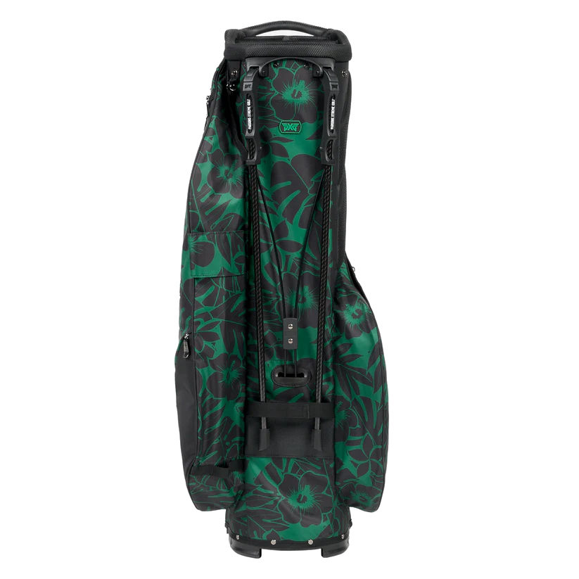 Get on island time in no time with our Aloha Hybrid Stand Bag. This festive bag is made from a durable polyurethane outer material and has a six-way top with 14 total pockets. It features a four-point single carry strap, a padded back panel, carbon fiber stand legs and a patented external magnetic putter attachment. It features our latest Aloha print—a hand-drawn design featuring native Hawaiian leaves and flowers—in green and black, ready to bring the fun to your next round.