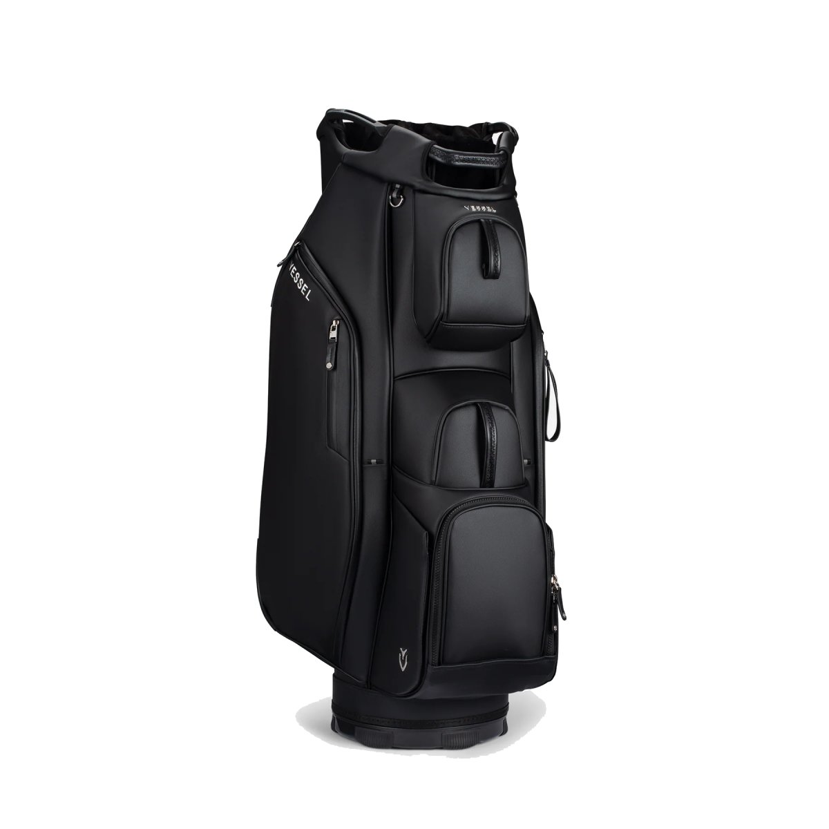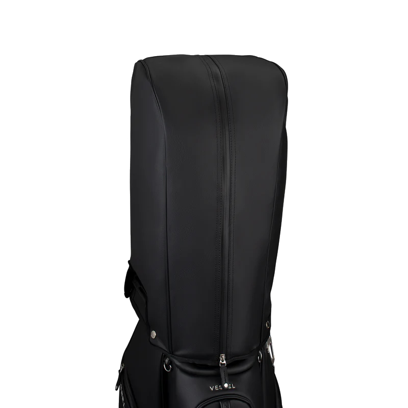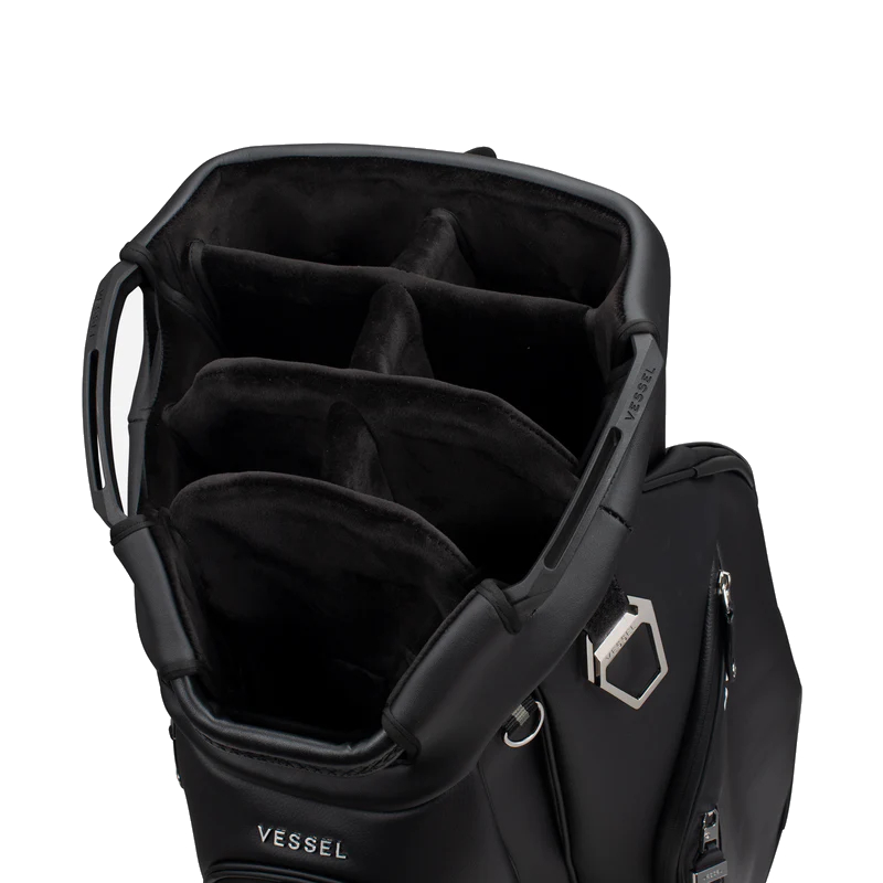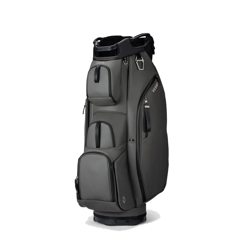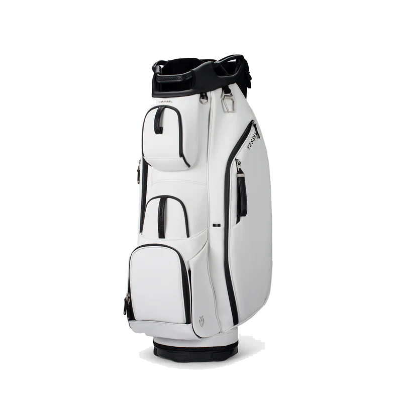The Lux Cart bag was intentionally designed to give you a premium riding experience. Starting with 2 forward-facing pockets and an upper pocket pod that swings over the cart strap and snaps down with a magnetic closure, securing your bag in place without restricting access to essentials while on a cart. With two antimicrobial lined personals pockets and a lockable valuables pocket, this cart bag offers plenty of storage for your valuables. Dual water bottle sleeves and a large cooler-lined compartment, fit plenty of beverages for a full round. Both top sizes feature a dedicated putter well and microfiber lined dividers for optimal club storage. Crafted with Vessel's signature attention to detail, the Lux Cart boasts genuine leather touchpoints, chrome finishes, and tour-grade body materials.