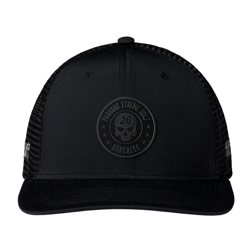 Turn heads on and off the course with a cap that blends airflow and attitude. The Darkness 6-Panel Trucker Patch Snapback available in black or white features a clean profile anchored by our signature Darkness Skull insignia patch. Mesh panels boosts ventilation while the curved bill and snapback closure deliver all-day comfort.