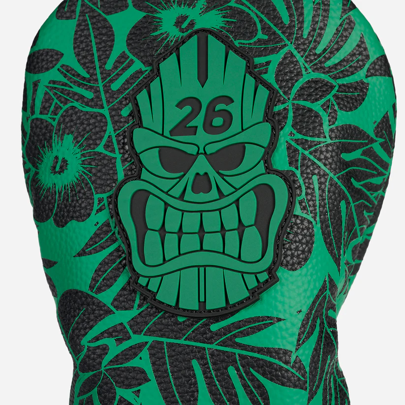 Nothing says fun like our Darkness Tiki Skull Driver Headcover. Wrapped in our Darkness Tiki pattern embroidered in green and black, this festive headcover is made with a durable polyurethane exterior and a plush velour interior to keep your driver from scratches. It features an interior QuickStick™ cart magnet to secure it to your golf cart when not in use.