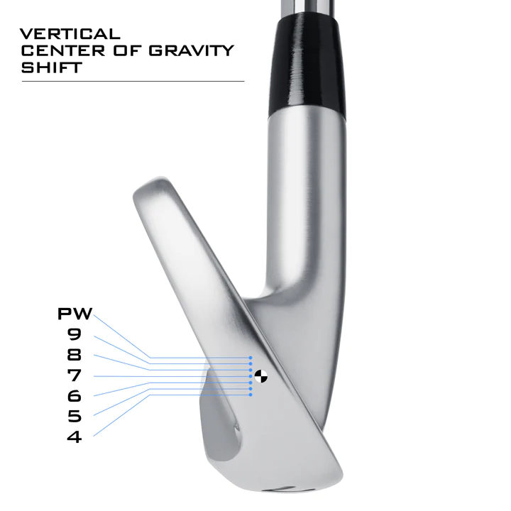 La posición del centro de gravedad dependiente del loft del tungsteno y los componentes CMC asegura una colocación precisa del COG en cada hierro. Este desplazamiento progresivo del COG genera un mayor lanzamiento en los hierros largos, retroceso controlado en los hierros de puntuación y una dispersión más ajustada mientras se mantiene un espaciado consistente a lo largo del juego.